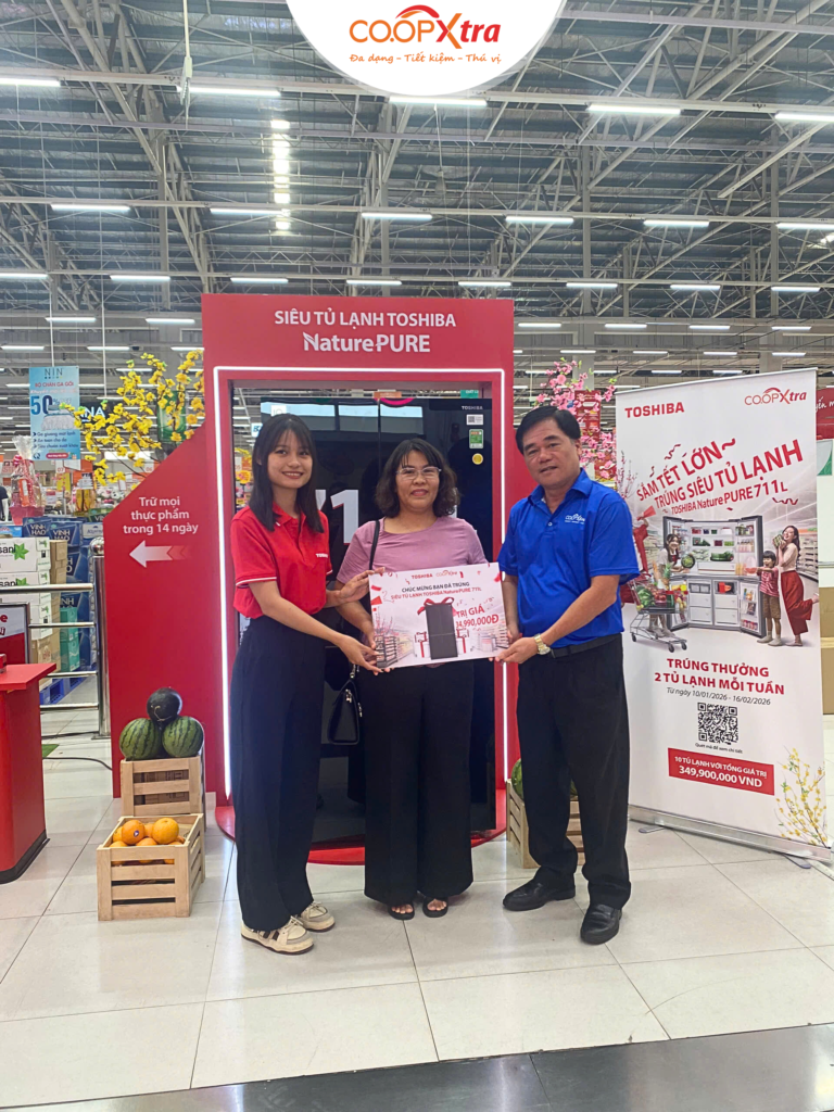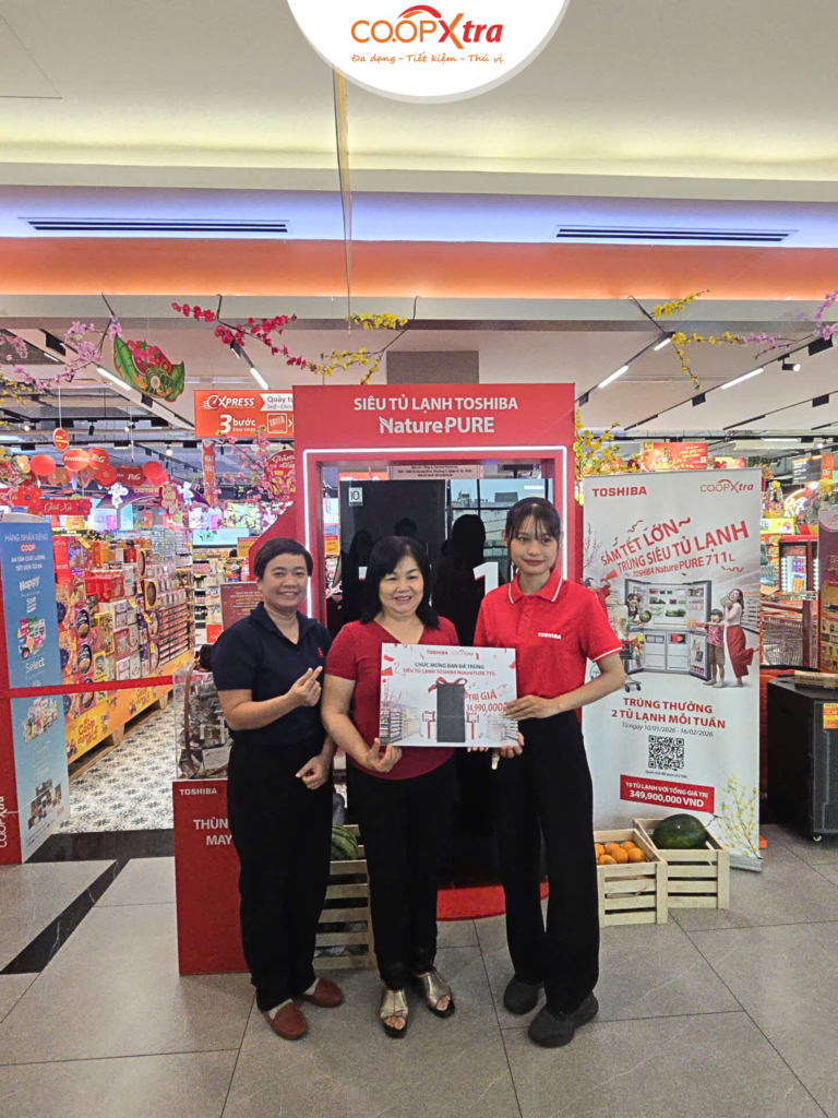 Nhằm mang đến cơ hội mua sắm và nhận quà giá trị cho khách hàng dịp Tết, Co.opXtra triển khai chương trình “Sắm Tết lớn – Trúng siêu tủ lạnh Toshiba 711L”, với giải thưởng là dòng tủ lạnh cao cấp dung tích lớn, giúp gian bếp gia đình thêm tiện nghi và hiện đại trong mùa Tết.