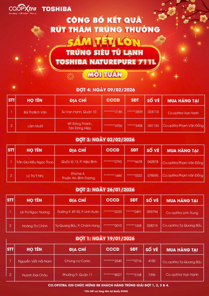 Khách hàng trúng giải đợt 01 (19/01/2026) tại Co.opXtra Vạn Hạnh và Co.opXtra Tạ Quang Bửu: